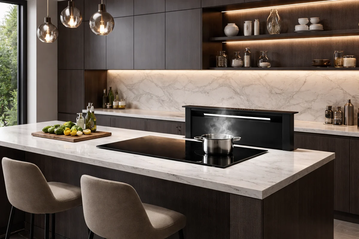 - Výsuvný odsavač z pracovní desky pro čistý design kuchyně